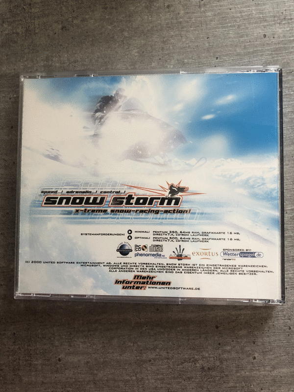 Snow Storm, ab 12 Jahre, ist ein Rennspiel, das von United Software entwickelt und veröffentlicht wurde. Sprache: Deutsch. Sehr seltenes Sammlerstück. Dieses tolle Spiel suchen jetzt einen liebevollen Neubesitzer und ist ein tolles Geschenk für einen Action Fan. Das Spiel befindet sich in einem guten gebrauchten Zustand, Tierfreier Nichtraucherhaushalt! Privatverkauf, siehe Fotos, jetzt nur 6,00€, Versand (€ 3,00) bei Kostenübernahme möglich