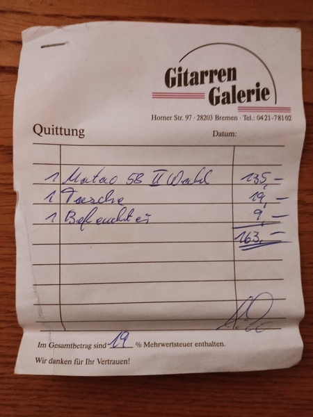 Ich verkaufe eine hochwertige Gitarre mit einem guten Klang. Sie ist II,Wahl, weil sie schon beim Kauf einen kleinen Kratzer im Lack hatte.