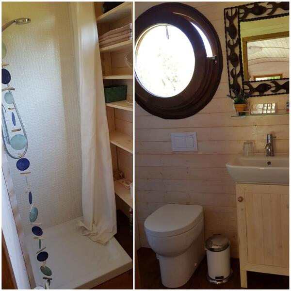 An den Wohnraum schließt sich das Bad mit Dusche, WC und Waschbecken an (ein Fön ist