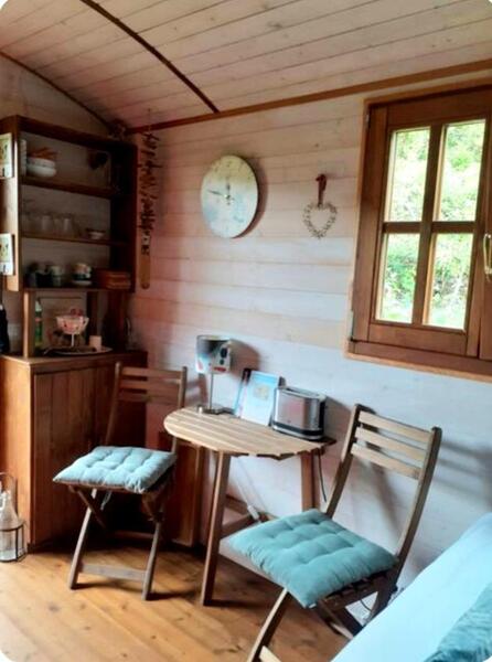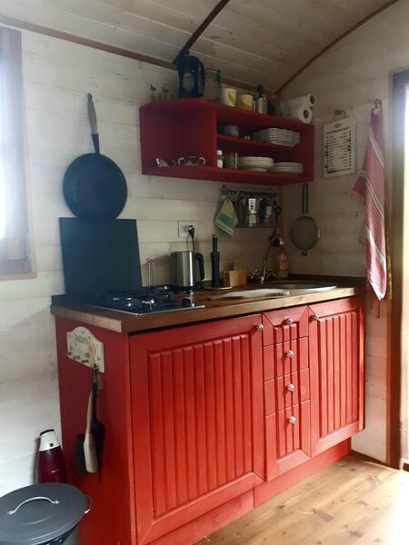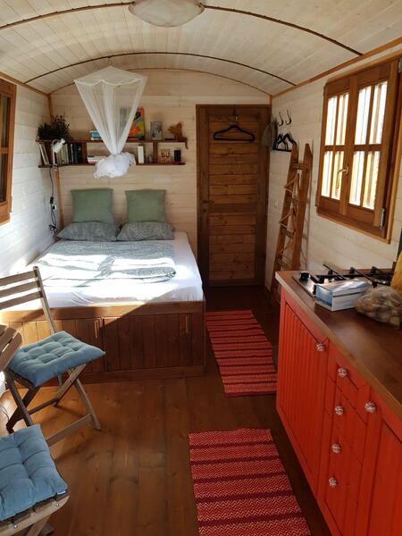 gestellte, stabile und isolierte Holzwagen ist komplett für 2 Personen eingerichtet.