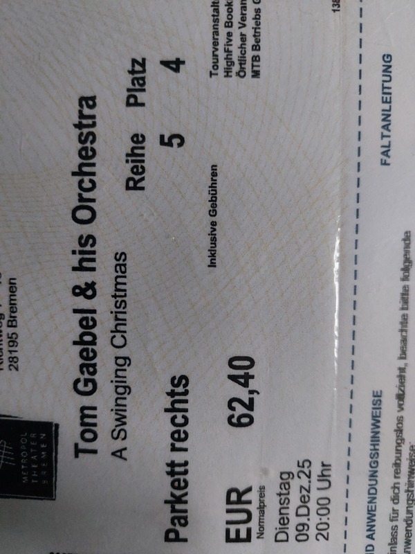 Hallo, habe 2 Karten für Tom Gaeble & Orchester zur Swing zu Weihnachten am 09.12.2025. Es sind Karten für die 5. Reihe jnd ich würde diese für zusammen 115€ abgeben. Bitte melden, LG vom Stephan