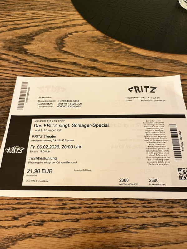 Ich habe 2 Tickets für das Schlager Spezial am 06.02.26 im Fritz Theater. Der Originalpreis beträgt 21,90 €, pro Ticket.