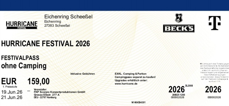 Zum Verkauf steht für das Hurricane Festival ein Festivalpass für 161,50 € zum Originalpreis der ersten Preisstufe.