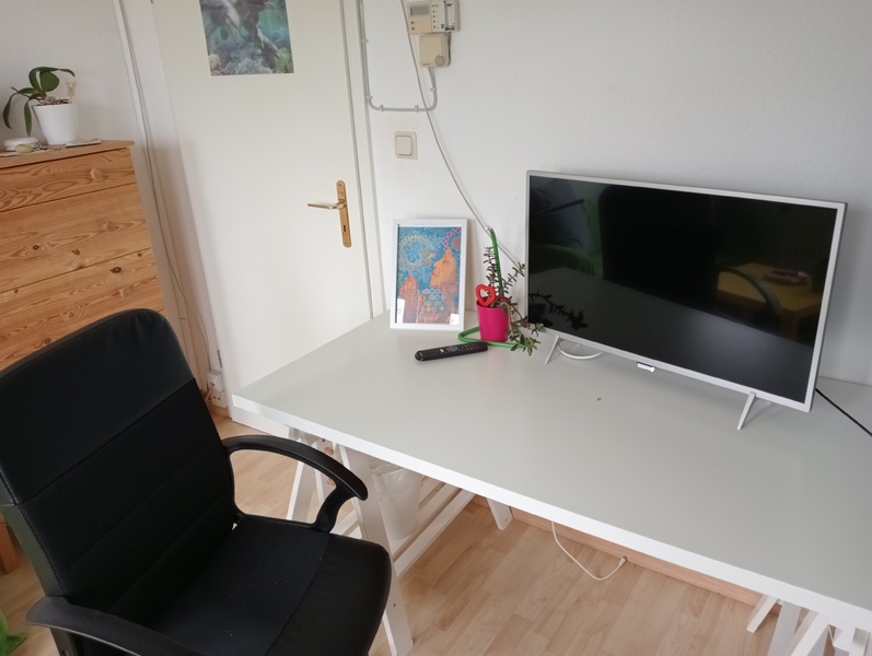 • Voll möbliert: Großer Schreibtisch mit gemütlichem Bürostuhl, Smart-TV, Highspeed WLAN, bequemes Bett (neuwertige Matratze) sowie Bettsofa, Schrank und Kommoden.