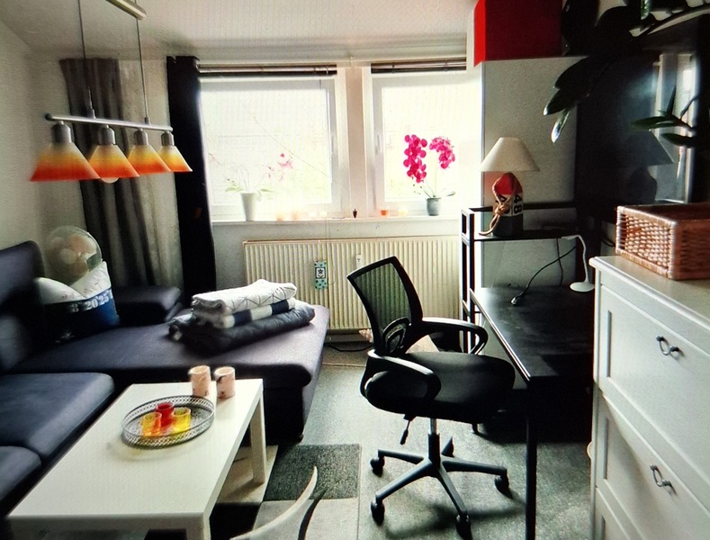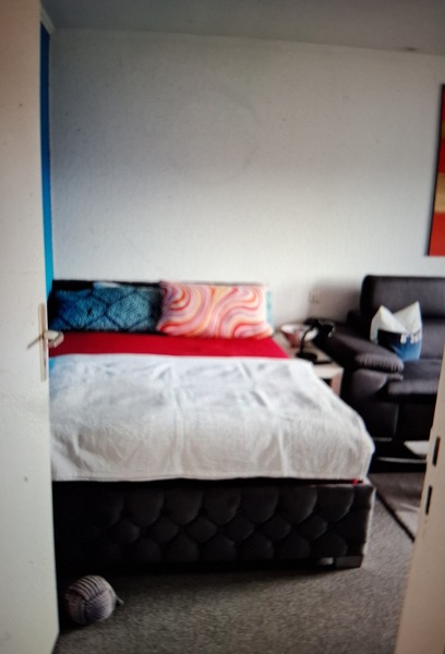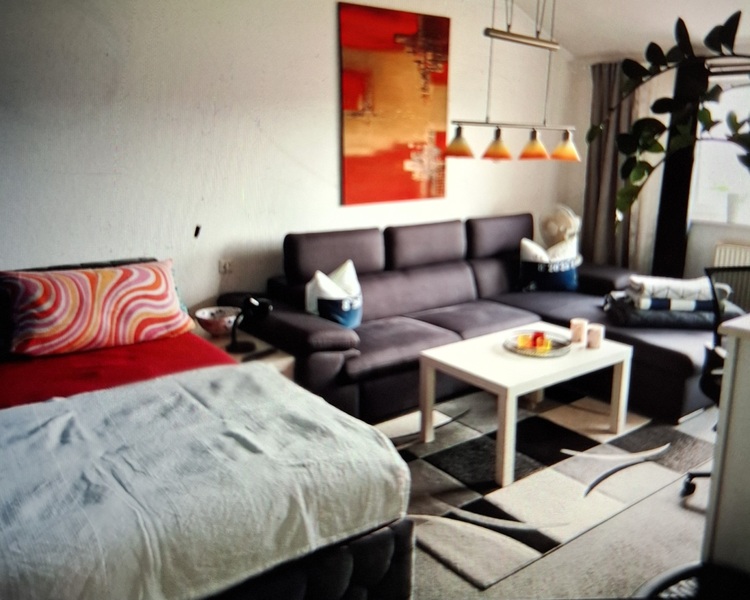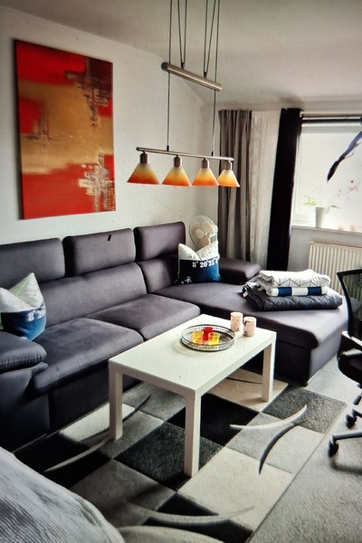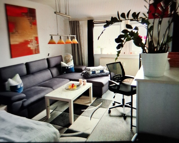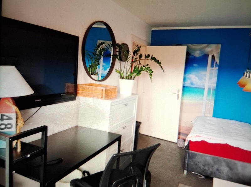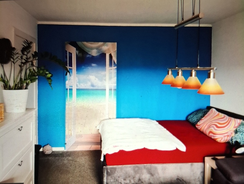 Ein weißer neuer Kleiderschrank steht dir auch zur Verfügung. Heiligt ist die neue angebrachte Fototappete die zum Entspannen einlädt. Über der Couch befindet sich ein schönes Bild in rot das den ganzen Raum abrundet. Unter dem Tisch ist ein großer roter Teppisch der auf grauer Auslegeware liegt. Über den Tisch hängt eine schicke Tischlampe. Ich habe neue Jallosien in grau angebracht und 2 schöne Blickdichte Vorhänge in Samt Schwarz sorgen für einen guten und erholsamen Schlaf. Du kannst die Küche und Bad mitbenutzen.