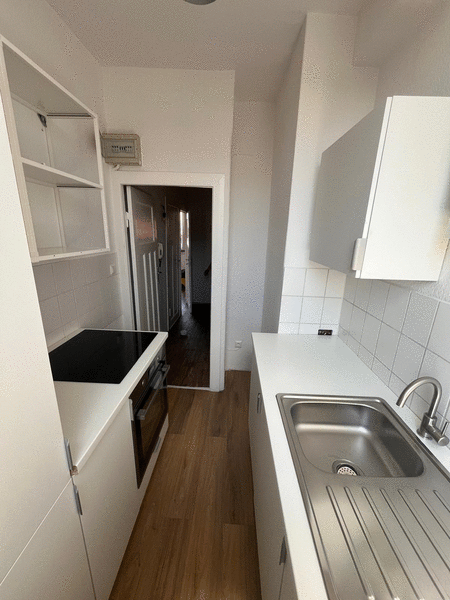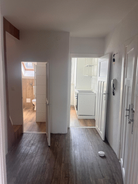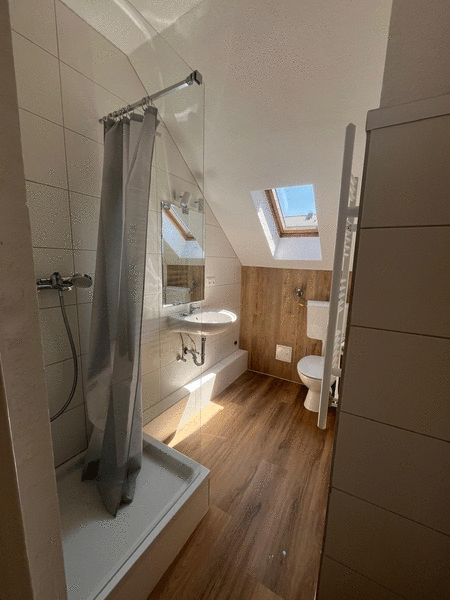 Das Zimmer ist hell und mit Holzboden ausgestattet. Die Küche ist vor einem Jahr neu installiert und mit Inventar (Geschirr, Besteck, Gläser und Töpfe) ausgestattet. Der kleine Flur lädt an einem Bartisch und Hockern zum Treffen unter den Bewohnerinnen und Bewohnern ein. Im Sommer bietet die Dachterrasse die Möglichkeit gemeonsame Abende zu verbringen. Das Bad ist komplett modernisiert und verfügt über eine Waschmaschine die zur gemeinschaftlichen Nutzung zur Verfügung steht.