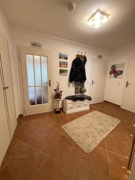 Diese komfortable und großzügig geschnittene Wohnung überzeugt auf den ersten Blick. Dieser fällt genau in die Diele, die groß und geschmackvoll gefliest ist.