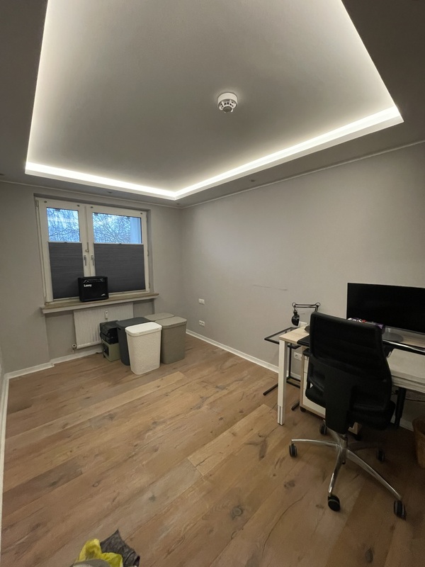 Die Einheit misst etwa 52qm, welche in angemessenem Verhältnis auf zwei Zimmer, eine Küche, ein Badezimmer und eine Süd-Loggia mit tollem Ausblick ins Grüne (Frühjahr & Sommer) aufgeteilt sind. Das Wohnzimmer ist sehr geräumig und ist ebenso wie das Schlafzimmer durch die großen Fensterflächen angenehm lichtdurchflutet. Beide Räume verfügen über einen abgesetzten Deckenstreifen mit indirekter dimmbarer Beleuchtung. Darüber hinaus erfolgt die Beleuchtung über großzügige, ebenso dimmbare Deckenspots.