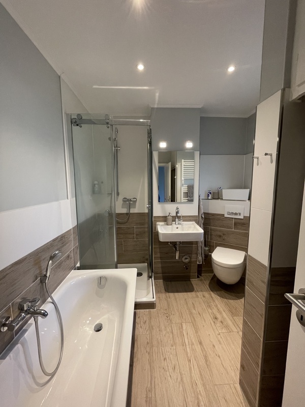 Die Ausstattung darf vom Mieter genutzt werden, Reparaturen sind vom Mieter zu tragen. Das Badezimmer verfügt über eine Dusche mit Echtglaskabine, eine Badewanne, Waschbecken und Toilette. Die Duschkabine wir schnellstmöglich erneuert. Ebenso befindet sich im Bad ein Anschluss für eine Waschmaschine / einen Waschtrockner. Im Flur befindet sich eine Gegensprechanlage für die Hauseingangstür sowie ein neuer in die Wand verankerter Schuhschrank, welcher gerne zu fairem Preis vom Vormieter übernommen werden kann.