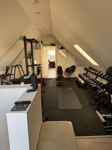 Im oberen Geschoss finden Sie einen langen Raum, der mittels Einbauschränken und einer Tür in zwei Zimmer unterteilt ist. So eignet sich der hintere Raum als weiteres Schlaf- / Gästezimmer. Der vordere Bereich ist aktuell als Fitnessraum umfunktioniert.